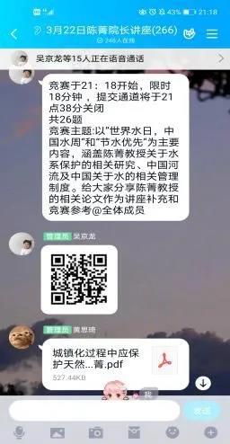 2020年3月22日晚,由农工院科协主办的农情大讲堂之学术讲座在QQ群以直播的方式如期举行。英国365集团公司官网陈菁经理受邀为全校的同学们进行了题为《城镇化过程中的水系保护》的学术讲座。讲座由农工院19级芦治宇同学主持。