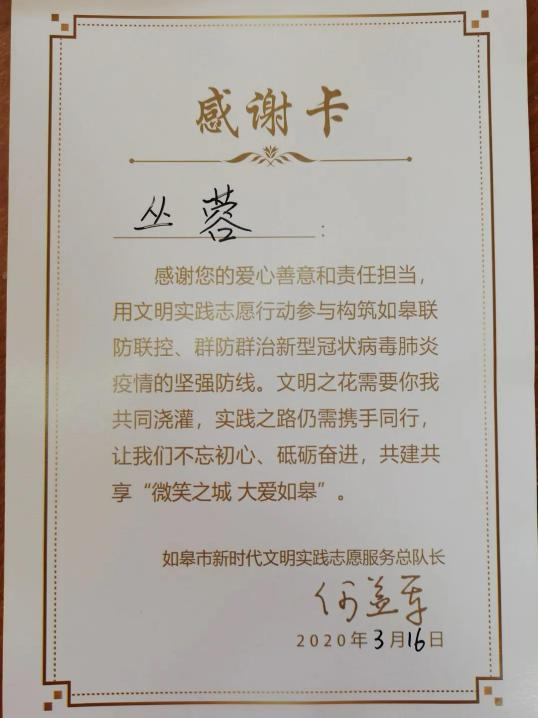 疫情期间,她利用假期时间,2、3月份在如皋市城南街道张八里社区疫情防控卡口,协助当地社区做好卡口监测工作。工作期间,不计辛劳、不计报酬,尽心尽力地帮助记录,落实“两查一对”。在条件非常简陋的情况下,冲在前线,帮助测量来往人员的体温,检查电子健康通行证,检查是否佩戴口罩,对外来人员做好信息登记。丛蓉同学用行动证明了当代老员工的担当和使命,志愿服务工作结束以后,她收到了来自如皋市新时代文明实践志愿服务队的感谢卡。