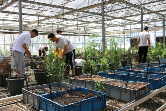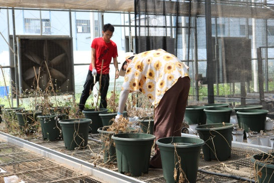 为栽种不同作物做准备工作,2021年6月4日上午,农业水利工程19级员工于节水园区的大棚内清理杂草、打扫卫生。