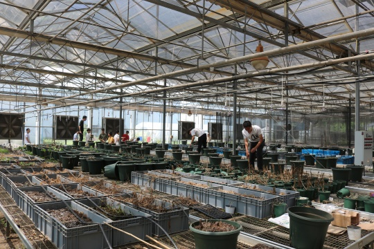 因久未清理,大棚内杂草丛生,一些种植盆栽里是枯死的植株,再加上炎炎烈日和大棚内的闷热,清理的难度大大增加。