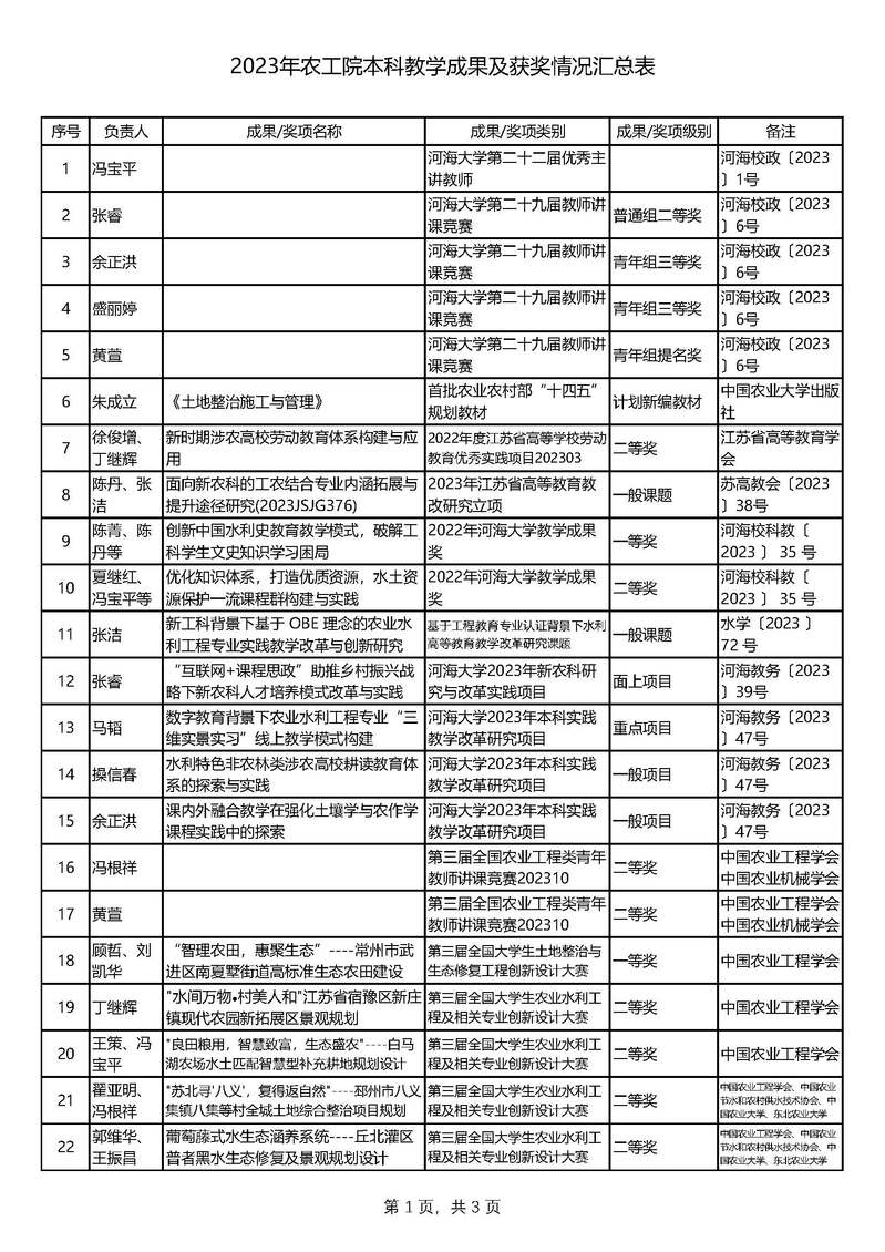 2023年农工院本科教学成果及获奖情况汇总表